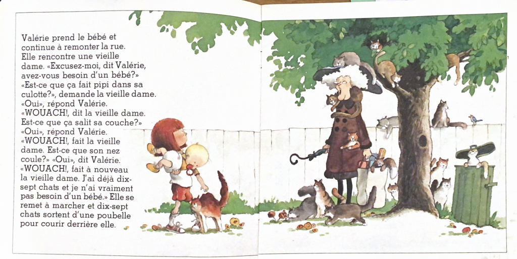 La deuxième personne rejette l’enfant parce qu’elle le trouve sale. «WOUACH!, fait la vieille dame. Est-ce que son nez coule? » « Oui », dit Valérie. « WOUACH! fait à nouveau la vieille dame. J’ai déjà 17 chats et je n’ai vraiment pas besoin d’un bébé. »
