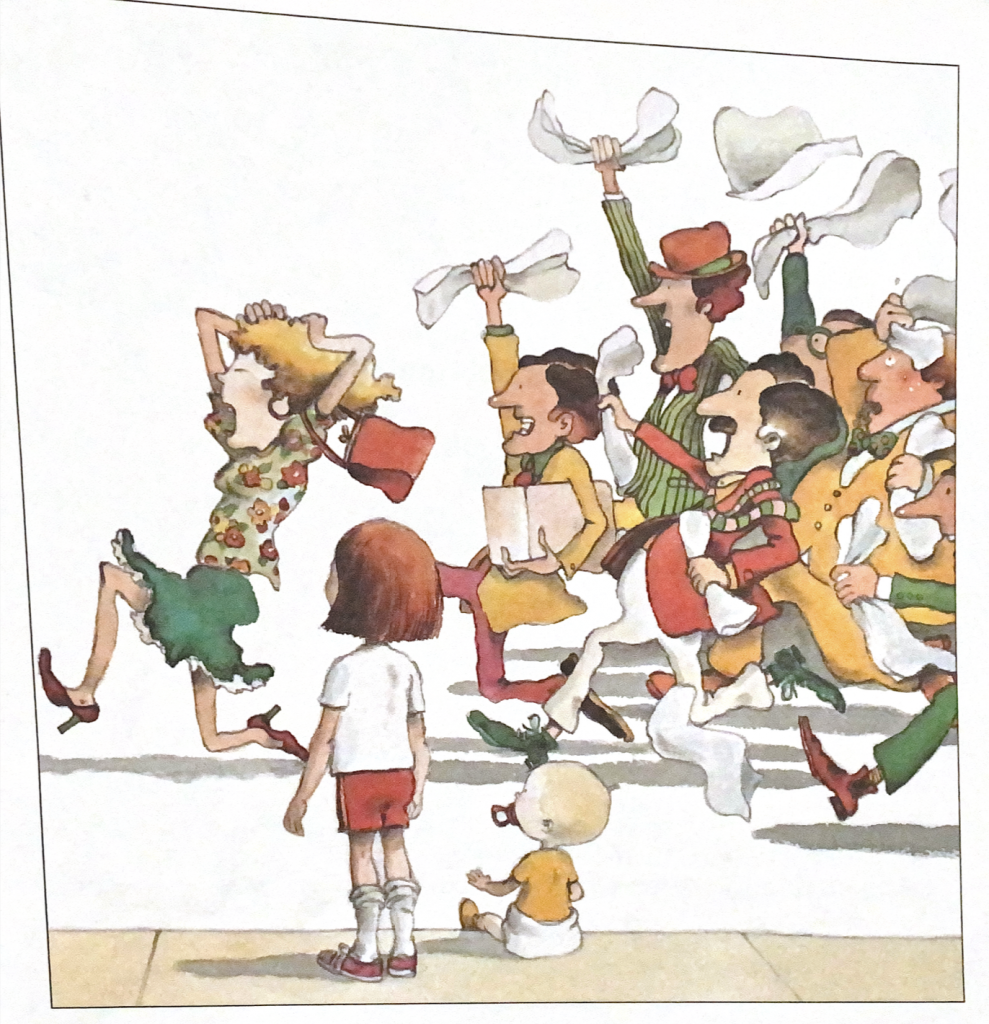 « Excusez-moi, dit Valerie, avez-vous besoin d’un bébé ?» (…) « Bien… en…en…!», répond le conducteur. «Gla, Gla, Gla», fait le bébé. « Tu as bien dit gla, gla, gla? », demande le conducteur. « Oui, répond le bébé. » « Alors, j’ ai besoin de toi » s’écrie le conducteur. Il prend le bébé dans ses bras et commence à remonter la rue.